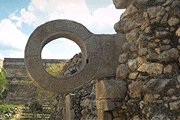 球戯場ですから、もちろん球戯をやるわけですが、 スポーツを楽しむためというより、神に捧げる儀式だったようです。 ここに見えるのが、いわゆる「ゴール」です。 どうやってゴールするんでしょう? ウシュマルホームへ