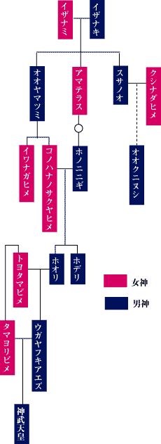 名前をクリックすると、それぞれの神にまつわるお話に飛びます。 CHECK! 必ずしも男女の神から子が産まれるとは限らない。たとえば、アマテラスはイザナキの目から生まれた神。 それぞれの神には、このほか兄弟姉妹や子供がたくさんいる。 オオクニヌシは、スサノオの末裔ということになっている。 神武天皇は、初代天皇とされる人物。 おみやげスーク 日本の神話ホームへ