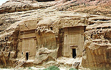 | 「カスル・ファリード」。一つの岩山に一つの墓がある。 | 二つ並んでいる墓。 |