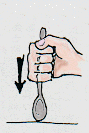 片手の親指と人差し指で、親指が手前になるようにスプーンの首の部分を持つ。このとき、小指は親指と反対の面の柄の先端の部分に当てておく。もう一方の手で皿の先端を手前に引く。スプーンを持った親指をまっすぐに伸ばし、首の部分をしっかり押さえるようにすること。