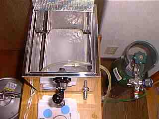サーバーの中にはアルミ製のラジエターのようなものがあります。この中にビールが通る通路があり、注ぐとその回路中をビールが通り、その間に冷えるわけです。(瞬冷式)このタイプだと、樽は常温のままで、瞬間冷却して飲めますので、いつでもキンキンなビールが飲めるというわけです。ここがビール会社の商品やおまけ、あるいはおもちゃ屋さんの生ビールサーバーと決定的に違うと言うわけです。氷は専用の冷蔵庫で一括して作っています。100円ショップのポリエチレン容器(約1.6L)を4つづつ製氷しています。これで、氷代もほとんどかかりません。