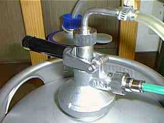一番絞りの樽にディスペンスヘッドを装着したところです。右にまわしてレバーを下げると準備完了。
