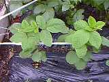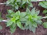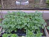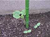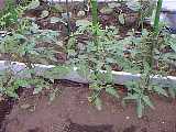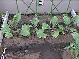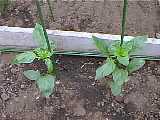 これは枝豆です。これも昨年は苗を購入して育てた(途中で嗄れてしまった)のですが、今年はやはり種からチャレンジです。植え方は結構簡単で、まず元肥を施したところに人差し指で土にブスッと突き刺し(深さ3cmくらいかな、結構イイカゲンです)、種を3粒づついれて土をかぶせます。確率的に大体2つは確実に発芽するようです。横に張っている白いひもはジャガイモのところで書きました風による倒壊よけのひもです。全景が無いので説明しにくいのですが、要は左右に棒を差して、ひもを二重に渡し、その間に茎を挟んだだけです。これでも結構役にたちます。