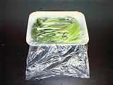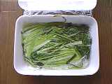 食感は野沢菜が細くなった感じで、風味は小松菜のほどよい苦味がなかなか良い様です。「素材の入手のし易さ」と「超簡単漬けこみ術」ということで、ここであえてご紹介する事にいたしました。「超簡単漬けこみ術」は何と言いましても特別な道具は一切不要で、どこの家庭にもある身近な廃品を利用しているところです。この漬け方は他にも色々応用できますので、是非ともお試しください。 名づけて「発泡トレイの2段仕込み」です。