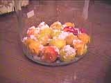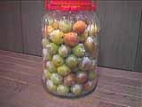 今度は数個づつをボールの中で、塩を焼酎で浸したものと良く混ぜ合わせます。表面にまんべんなくまぶせたらガラスビンの底ににならべてゆきます。