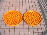 次にザルに梅を一つ一つ丁寧の乗せてゆきます。梅同士が着かないように適当に間隔をあけてならべてゆきます。ちなみむ、写真のザルは直径45cmで、これ2枚で3kgの梅が丁度すべて干せます。(梅3kgで約130粒くらいでしょうか) すべて乗せおわったら良く日のあたるところに干すわけですが、最初2〜3時間たったらすぐにひっくり返すようにしています。干しはじめは、梅は梅酢をたくさん含んでいて、乾燥してゆくと梅酢が固まって、梅とザルがくっついてしまう事があるからです。梅の実・梅酢・塩分の具合にもよると思いますが、一昨年はこれで30個ばかり皮がやぶれてしまいました。