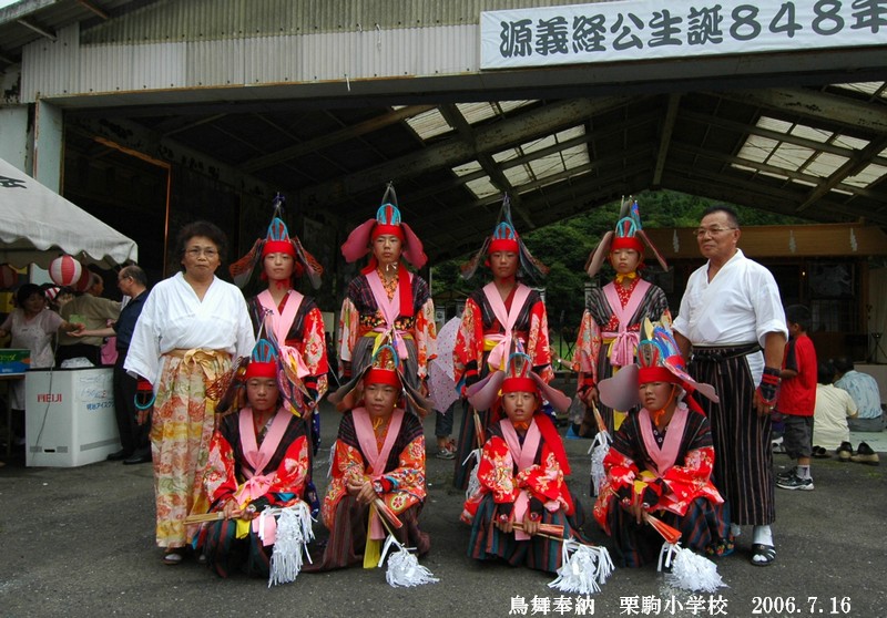 この南部神楽の伝統の中で、栗駒小学校の「鳥舞」は、そんなに古い歴史をもつものではない。1980年春、栗駒小学校のPTA役員だった千葉洋子氏が、当 時の栗駒小学校の校長先生と相談の上、存続が危ぶまれていた「鳥舞」を、子供たちに教えたら、教育にもよい影響があるのでは、との考えから「栗駒小学校神 楽保存会」を結成したのが始まりであった。千葉さんは、栗駒から山ひとつ越えた文字地区の出身であるが、それからというもの、子供の頃に見よう見まねで 習った「鳥舞」を再度研究、自らで鳥舞の衣裳一切を手作りで制作し、踊りの指導を長年に渡って続けて来られたのである。