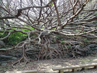 海風の強い地域で生息していく為の進化過程にて、このように根を岩に絡ませて樹高を低く保つようになったんだとか。