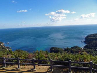 遠方にちょいと出っ張って見えるのは、これから向かう予定の安乗埼灯台、の筈。