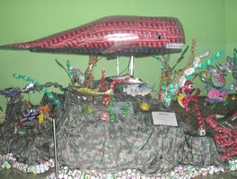 さて、館内の入り口にて門番を務めていたのは、空き缶だけでつくられた「エコ・クジラ」さん。