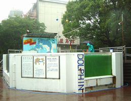 イルカ・ショーが始まるよとのアナウンスがあったので、どしゃぶりの雨の中、屋外にある