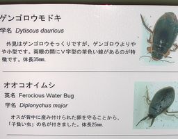プレートにある名前は「ゲンゴロウモドキ」「オオコオイムシ」「ミズカマキリ」など。