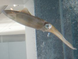 で、右は下部に潜り込めるタイプの水槽にいた「アオリイカ」。