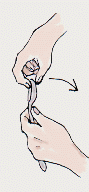 片手の親指と人差し指で、親指が手前になるようにスプーンの首の部分を持つ。このとき、小指は親指と反対の面の柄の先端の部分に当てておく。もう一方の手で皿の先端を手前に引く。スプーンを持った親指をまっすぐに伸ばし、首の部分をしっかり押さえるようにすること。