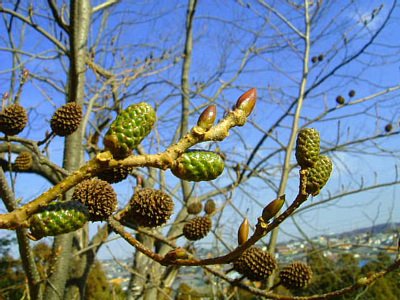 枝先の赤褐色で円錐形は、花芽か葉芽で芽鱗に包まれています。