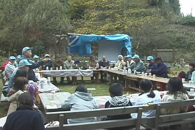 液晶プロジェクタによる100インチの大画面には、「あらい沢」音頭をバックに荒井沢の四季が放映され会も盛り上がったころ、関口さん(前県会議員)の中越地震ボランティア活動の体験談や下山田さん(愛護会最高齢)の健康の秘訣、武淵さんの四十雀の巣箱作り、上郷の森の皆さん活動など会話が弾み、芋煮も2杯、3杯とお代わりの連続で、大好評でした。