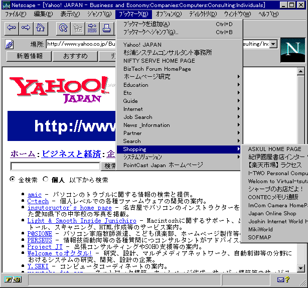 次の画面はブラウザソフトのネットスケープでブックマークを参照しているところである。