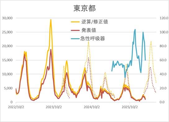 急増が続き、もはや流行期に入ったと思われるので、予想を入れてみました。