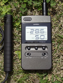 リクガメの飼育においては、たとえば孵化器の内部の温度などです。1度違うために孵化しなかったり、メスとオスの違いが生じたりといったことが起こってくるわけです。森リクガメ研究所では、自作の孵化器を利用していますが、内部の温度については、中に4種類の温度計を入れて測定していましたが、困ったことに、すべて異なる数字を示すのです。それぞれの温度計の特性の違いや精度の違いによるものでしょうが、正確な温度を知る必要があるものについては、正確に測定できる器具で測定しなければ意味がないと考え、温度計を探してみました。