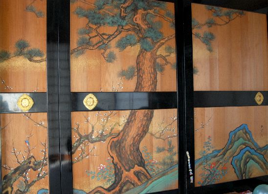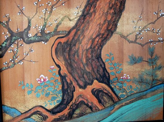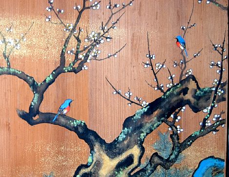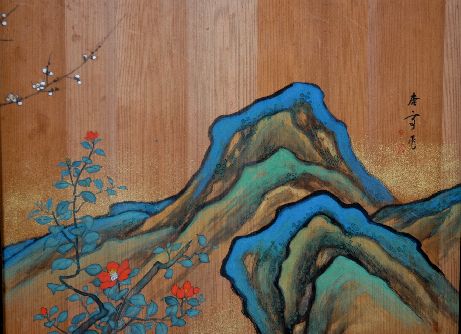 杉戸絵「加賀の春」の概観(表面) 杉戸絵の杏亭翁の加賀の春、栗駒山麓千葉家に拝す