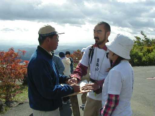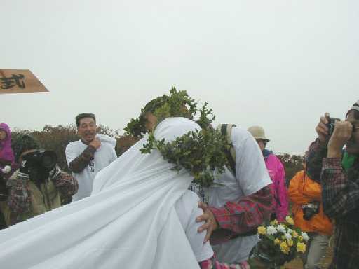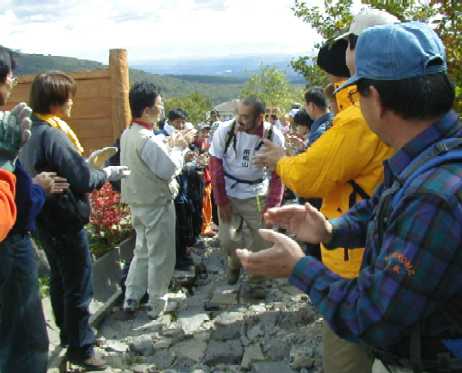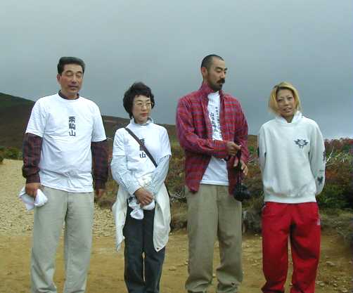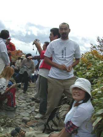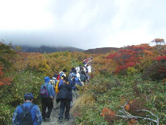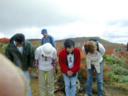 このユニークな「山頂結婚式」に出席したのは、二人の郷里の横手市と会津若松からやってきた家族と、「自然学校」のスタッフと友人達、約60名ほど。司会進行は、もちろん二人のボスである佐々木豊志校長。一行は、いわかがみ平を9時半過ぎに山頂に向けて出発した。当初少しガスがかかったていたが、それが逆に神聖な雰囲気を醸し出してくれた。紅葉真っ盛りの登山道をバージンロードに見立て、やや緊張気味に歩き始めた一行であったが、途中から、一般の登山者も加わり、和気藹藹(わきあいあい)の素敵な結婚式となった。