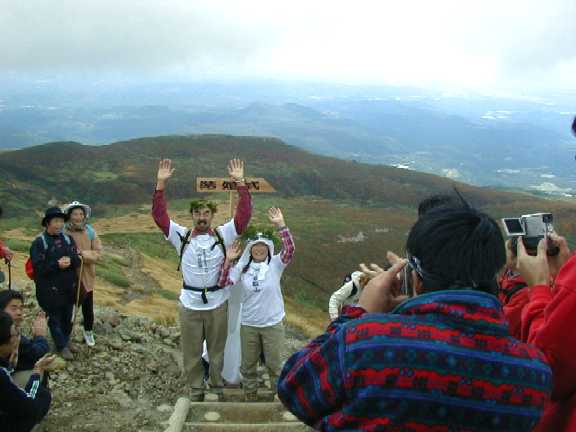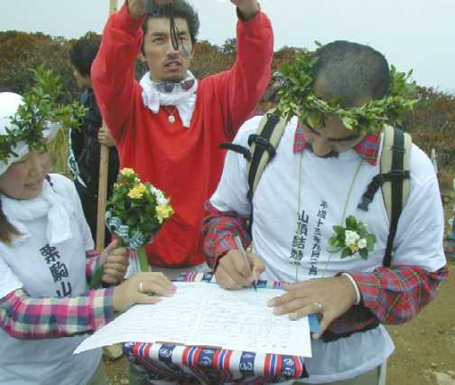 秋の栗駒山はひときわ美しい。何しろ紅葉前線が山頂からつ浪のように里へ里へと押し寄せてきて、やがて全山は、錦の衣を羽織ったようになる。そんな秋真っ盛りの2001年9月29日、栗駒山で、初の「山頂結婚式」が執り行われた。新郎は、「くりこま高原自然学校」の若きスタッフ通称「との」と呼ばれる金沢直樹くん(出身地秋田県横手市)25歳。新婦は、渡り鳥の生態調査をしているという「まめ」こと佐藤真由美さん(同会津若松市)24歳。二人の出会いは、もちろん「栗駒山」。二人は子供達に自然の素晴らしさを体験学習するための民間施設「くりこま高原自然学校」(佐々木豊志校長)のスタッフ仲間だ。どうやら若き「との」と「まめ」ちゃんは、栗駒山の自然の中で秘かに愛を育んだようだ・・・。