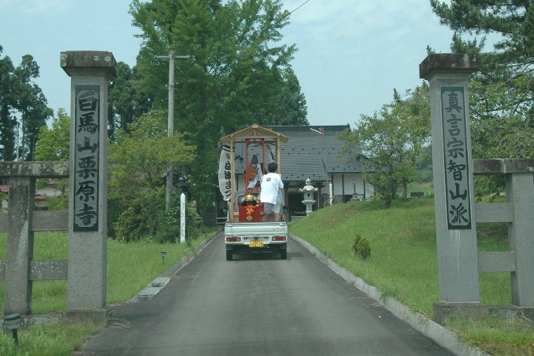 沼倉の判官森より義経公の鎧神輿と兜をのせた笈が軽トラックで栗原寺へ向かう