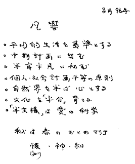 投稿してくださったFさんの友人の部屋の玄関脇においてあったもの。もう1通文書があったが、この文書のみ残っているとのこと。穏やかな文面で個人の信条のような事が述べられているものの、主語が欠落しており誰から誰宛のメッセージなのか判然としない。また「凡響」「半主権」「心とする」「初む」などの特殊な用語・いいまわしがこの文書の意図を一層あいまいなものにしている。[吉野] |